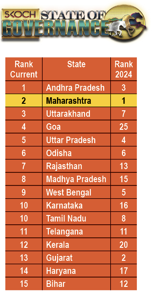 Maharashtra sits at #2 in the 2025 SKOCH State of Governance rankings (Jan-Sept 2025), inside a tightly packed lead group where small changes in volume and quality can swing outcomes.