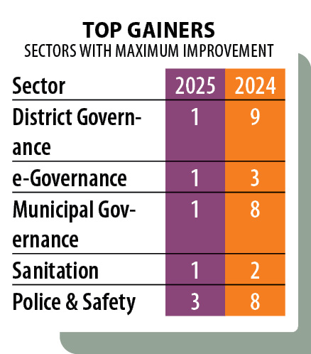 The state leads the country in District Governance and Municipal Governance, reflecting a model where decision-making, monitoring and service delivery are actively pushed closer to citizens. This decentralised emphasis is visible in the volume and quality of initiatives emerging from district administrations and urban local bodies.