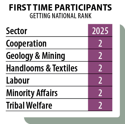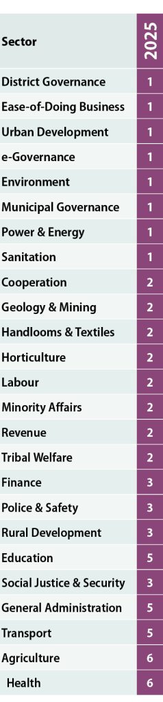 A distinct feature of Andhra Pradesh’s 2025 performance is how it handled first-time participation in multiple governance domains – such as cooperation, labour, handlooms and textiles, minority affairs, tribal welfare and mining-related administration.Entering these sectors without prior benchmarking, the state still achieved strong national positioning.
