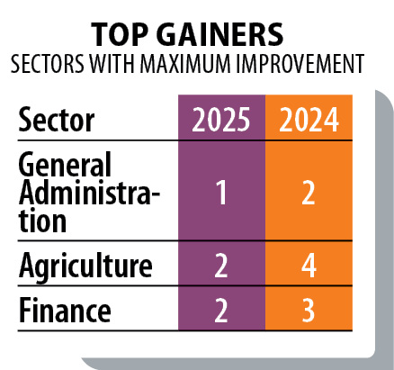 In Finance, improvements are anchored in fiscal transparency, digital treasury systems and enhanced monitoring of fund flows. Real-time expenditure tracking and structured budget execution have improved resource allocation across departments. The combined progress in Agriculture and Finance signals coordinated reform where sectoral ambition is reinforced by fiscal discipline.