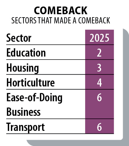 Meanwhile, Transport and Ease-of-Doing Business have regained competitive standing. Digitised permit systems, infrastructure upgrades, single-window clearance mechanisms and time-bound approvals have strengthened regulatory efficiency. The comeback across these sectors suggests recalibration not isolated reform.