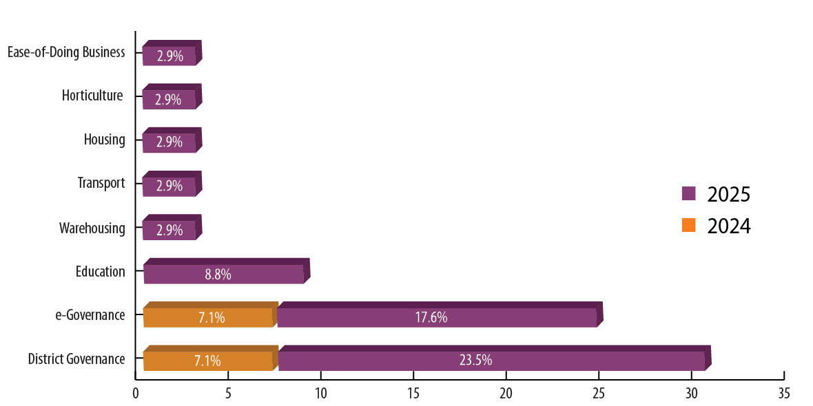 Projects in this domain demonstrate streamlined decision-making processes, digital workflow systems and improved citizen interface mechanisms. Strong performance here suggests that reform is embedded in the state’s administrative backbone rather than limited to sectoral schemes. When core systems are strengthened, sectoral delivery improves. Rajasthan’s broader 2025 performance supports that view.