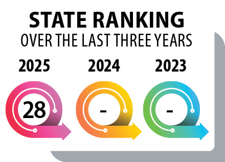 A smaller administrative canvas and continued benchmarking alignment define its state’s footprint