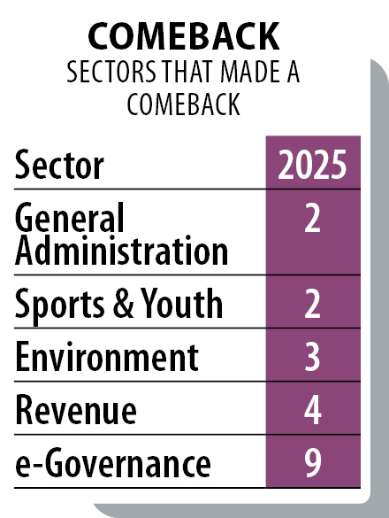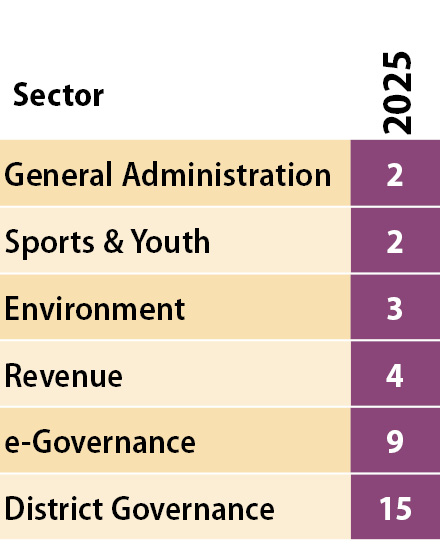 The broader narrative of 2025 is not defined by a single dramatic leap. Instead, it is shaped by coordinated rebounds in Environment, Revenue, e-Governance, Sports & Youth and General Administration. Fifteen well-performing projects from the state qualified for deeper study this year.